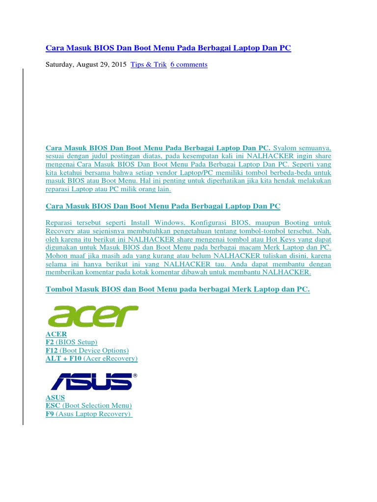 Cara masuk bios dengan hotkey keyboard.